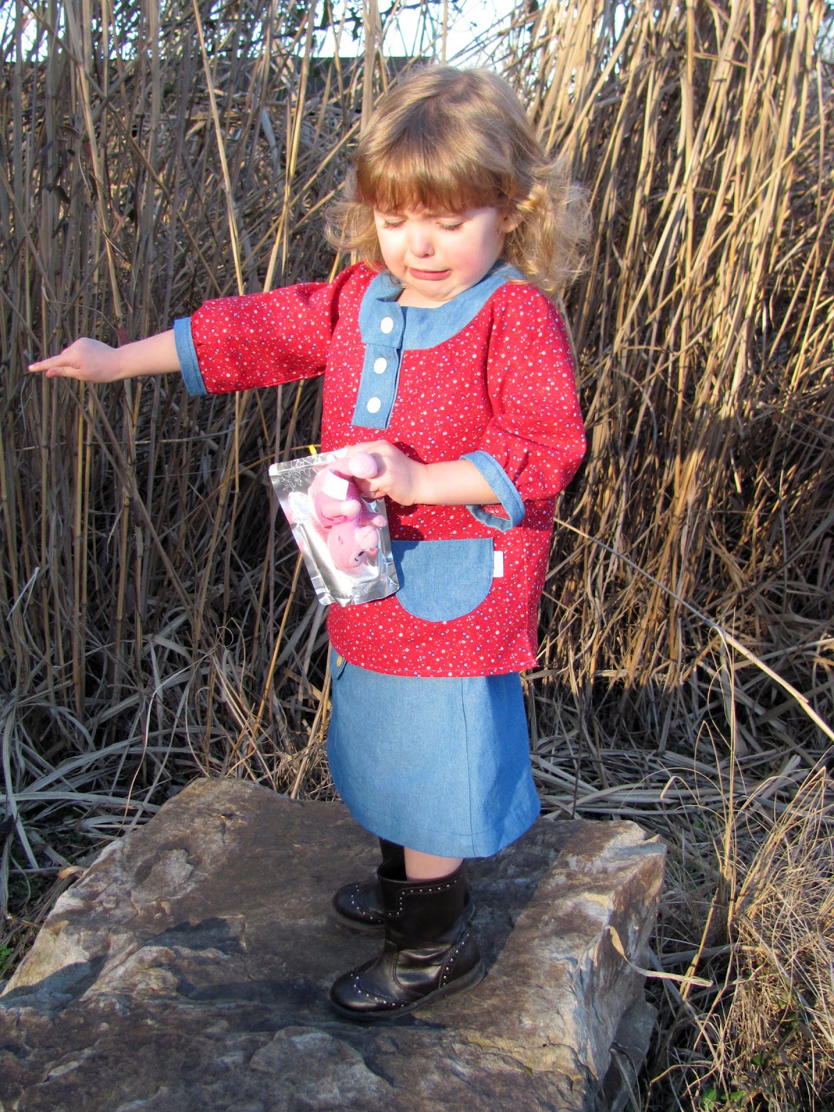 I then needed to test the pattern again, so I found this cute piece of red calico fabric and some really soft denim in my stash. This time, I wanted to make an entire outfit. But we'll have more on that later.